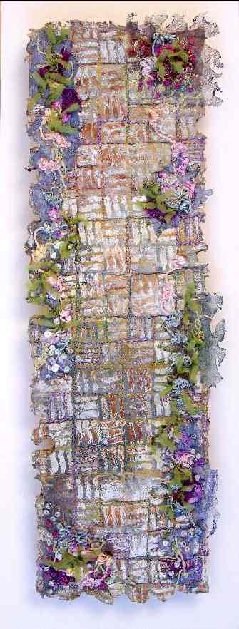 Extract from article by Kate Hopper in Sewing World June 2008: How did you become interested in embroidery? I had my school days to thank for introducing me to the world of stitch. In the 1950s, my junior school encouraged hand stitching. Secondary school continued this interest, with the traditional embroidery on the cookery apron and an embroidered piece for "O" level. This love of stitch gave me a career choice. So off I went to teacher training college to become an home economics teacher with "stitching" as my second subject. Throughout my teaching career I continued with both subjects and my main interest then was with my local patchwork and quilting group. As the offspring flew the nest I found that I had more time to give to my creative thirst, so I decided to do City And Guilds embroidery part 1. This course gave me the design boost and the opportunity to dabble and experiment with many techniques. |